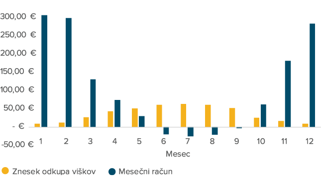 Na ta način se vam mesečni strošek za električno energijo vsak mesec avtomatično zniža za odkupljeno energijo s strani GEN-I. V poletnih mesecih, ko je proizvodnja električne energije velika, vaše potrebe po njej pa manjše, to celo pomeni, da bo vaš strošek za električno energijo enak 0 €. Še več, preostala vrednost odkupljene energije se vam bo kot dobropis prenesla v naslednji mesec in vam znižala višino stroška tudi takrat.
