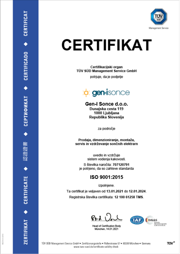 GEN-I Sonce se je v certifikacijskem postopku izkazalo tako na področju prodaje in dimenzioniranja sončnih elektrarn kot pri zagotavljanju servisa in vzdrževanja naprav, za kar je prejelo certifikata ISO 9001:2015 in ISO 14001:2015.